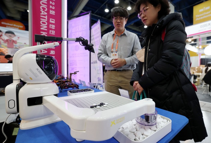 서울 강남구 코엑스에서 열린 대한민국 교육박람회에서 관람객이 'AI 바둑 로봇'을 살펴보고 있다. 2025.1.15. (ⓒ뉴스1, 무단 전재-재배포 금지)